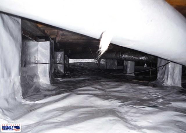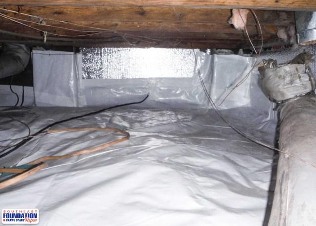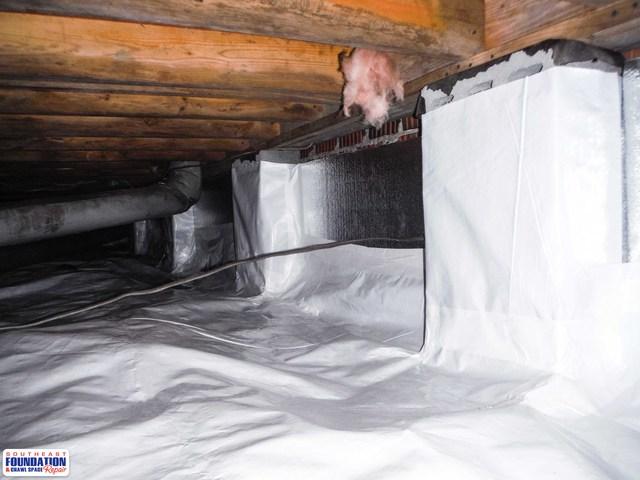 The CleanSpace Encapsulation System Liner is tacked over the foundation walls and floor to that we are able to create a continuous air and moisture barrier.
